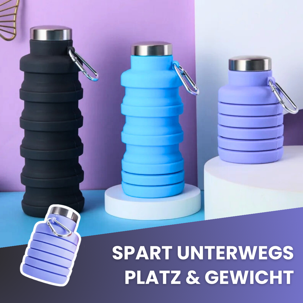 Unsere faltbare Trinkflasche ist das ideale Accessoire für unterwegs – kompakt, robust und wiederverwendbar!