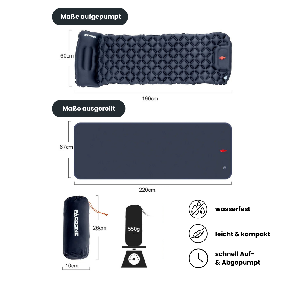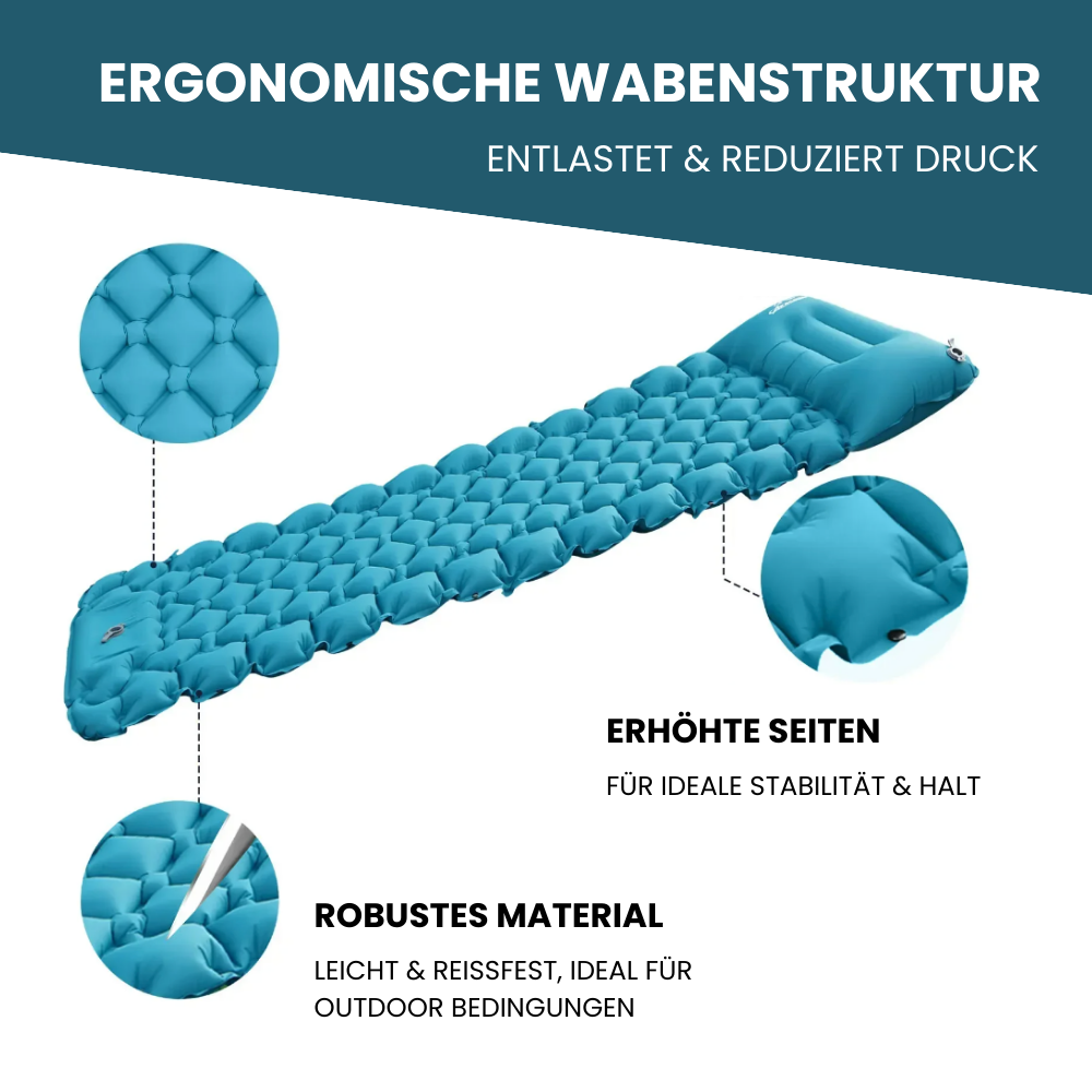 🛏️ Maximaler Komfort: Die ergonomische Wabenstruktur stützt deinen Körper und schont die Gelenke. Die integrierte Kissenerhöhung sorgt für zusätzlichen Schlafkomfort unterwegs – ganz ohne extra Gepäck.